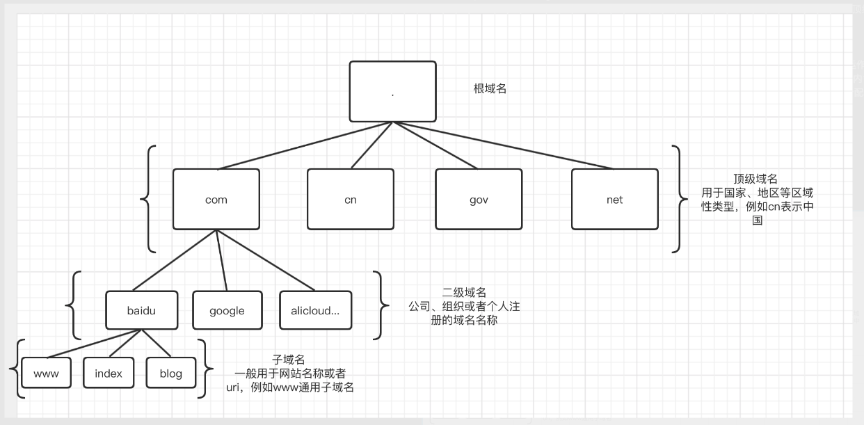 说到DNS就离不开域名(Domain Name),因为DNS主要解析以及存储的对象是域名相关的数据。域名是一种树状结构,形如:www.baidu.com的多级文本构成,其中不同层级用"."来进行区分。同时域名的层级是从右往左递增的。例如上面的www.baidu.com从右往左开始