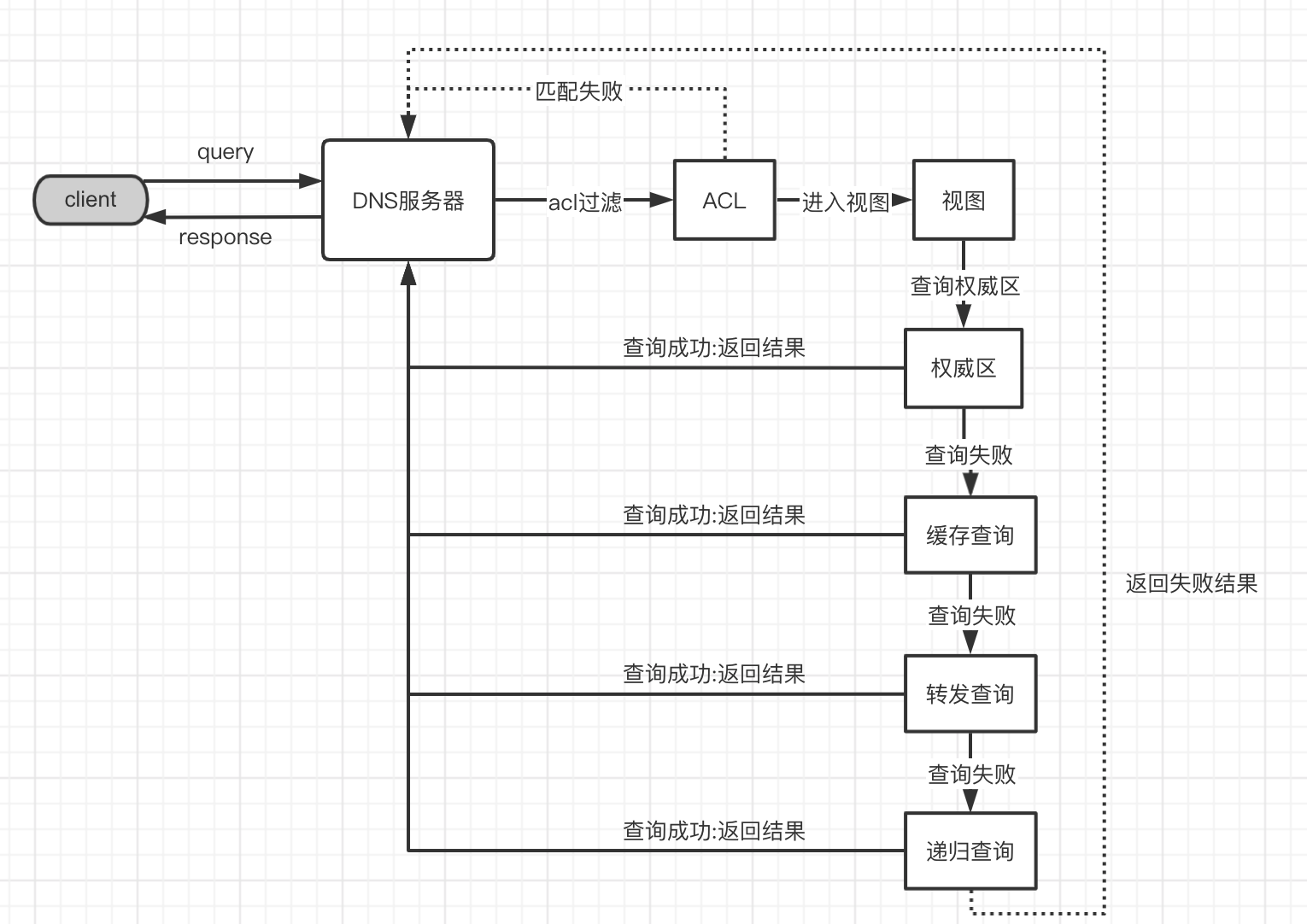 ACL顾名思义就是访问控制列表,通过配置ACL来运行或者禁止对应的IP或者望断访问DNS。如果被禁止或者在允许访问范围外的IP请求dns解析,则会返回serverfail,无法进行dns解析。