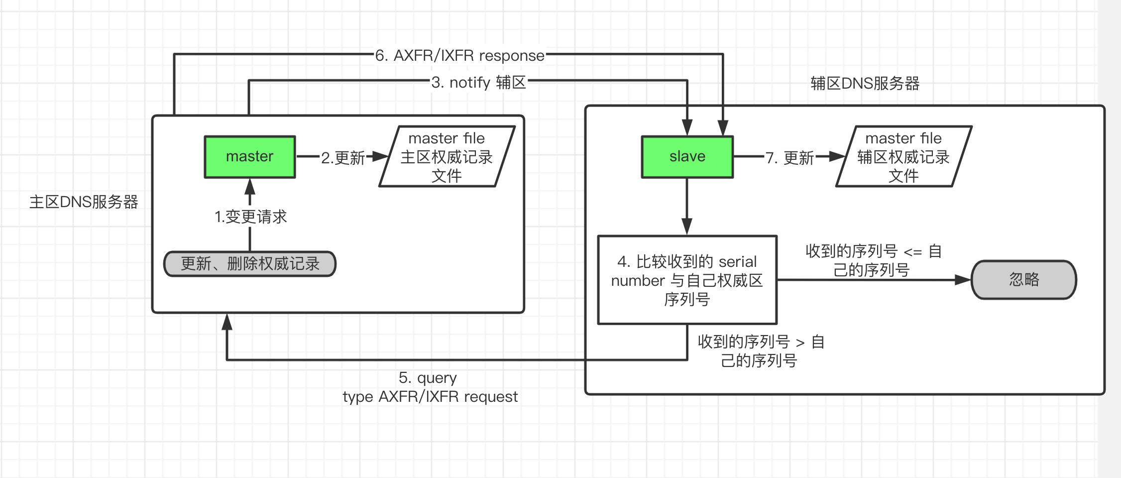 权威区的类型主要分为两类:master以及slave,一般主区(master)用于存储、更新权威记录,而辅区(slave)则是定期同步主区的资源记录过来,而一般是多个辅区提供对外域名解析服务。