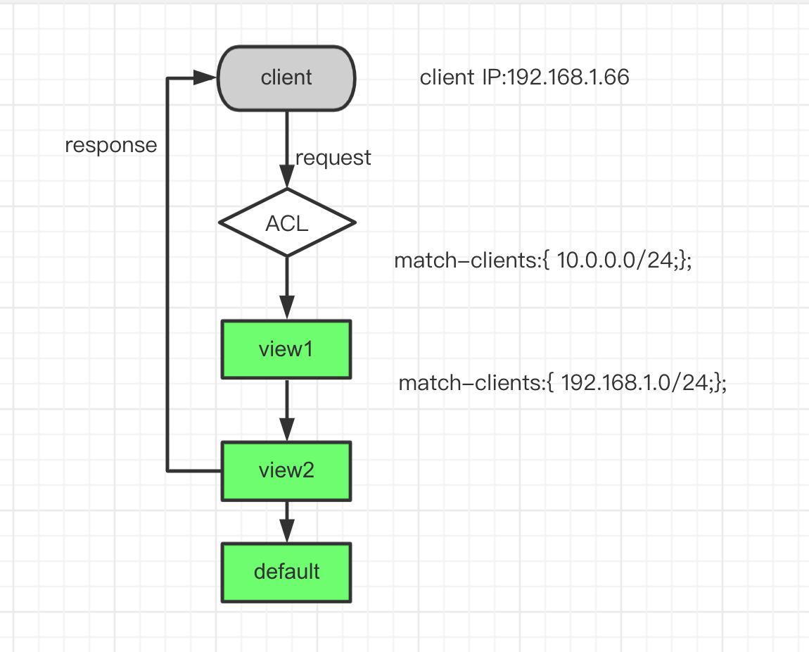 视图作为DNS的一个重要组成,起到一个隔离作用,即根据配置不同的视图以及权威区,并且通过不通的视图选择方式返回相应的解析结果。例如下图的客户端IP为:192.168.1.66,请求dns服务器,此时dns配置了两个视图分别是view1以及view2,因为view1的优先级别更高,因此会优先匹配view1,当没有匹配到view1时,则会去匹配第二个视图view2,而此时view2的匹配列表里包含了子网192.168.1.0/24,是包含192.168.1.66的,因此匹配view2,进入视图。